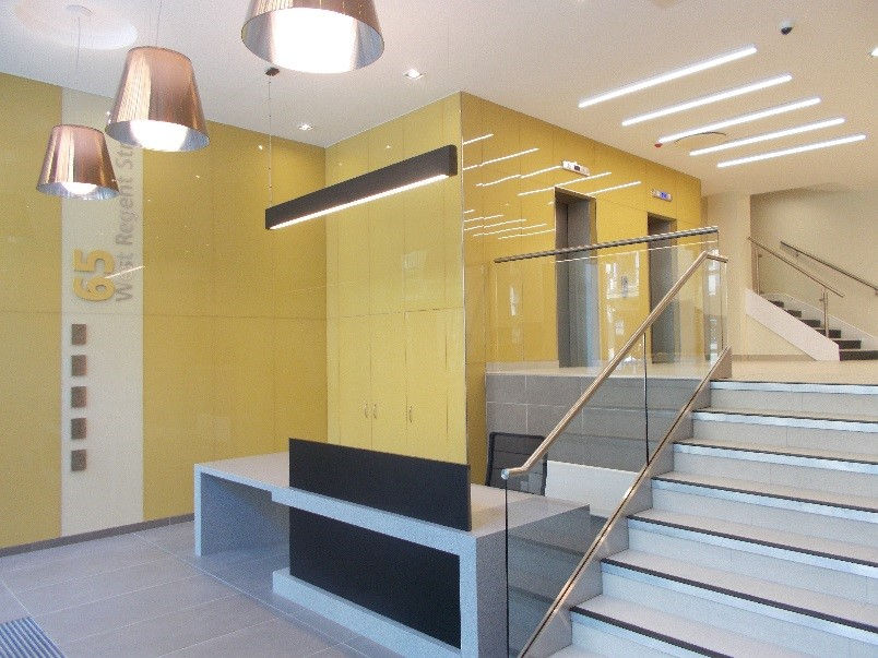 65 West Regent Street is located in the heart of Glasgow City Centre. It is a five storey office commercial property. It received an extensive high quality cost efficient refurbishment in 2016 designed to provide flexible and a safe working space. The refurbishment works created an impressive remodelled reception, open plan floor plates with a renewal of all finishes and M&E throughout, including an air conditioning VRF system throughout as well as external façade works.